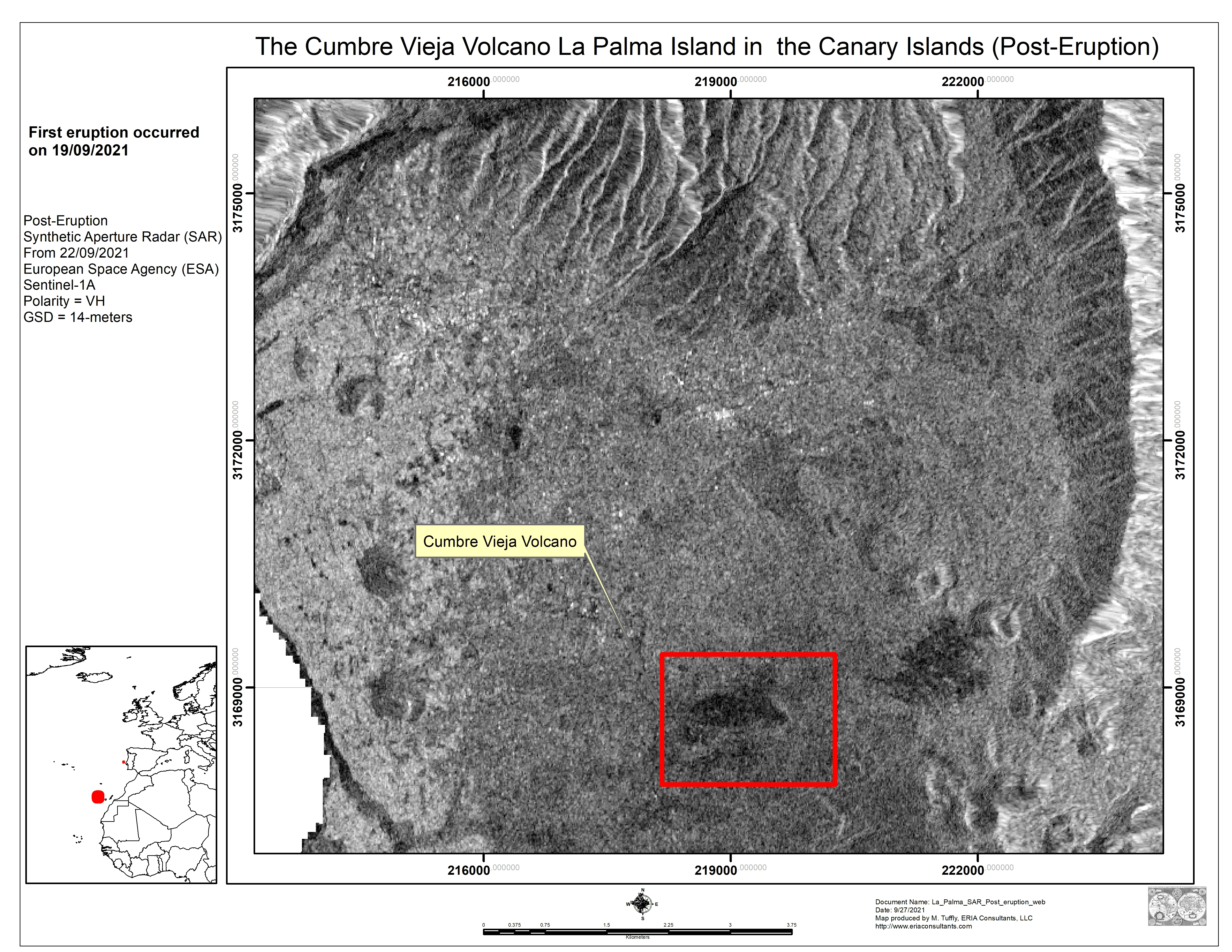 Cumbre Vieja Volcano on La Palma Island in the Canary Islands using Synthetic Aperature Radar SAR)(September 22nd 2021) Animated Version