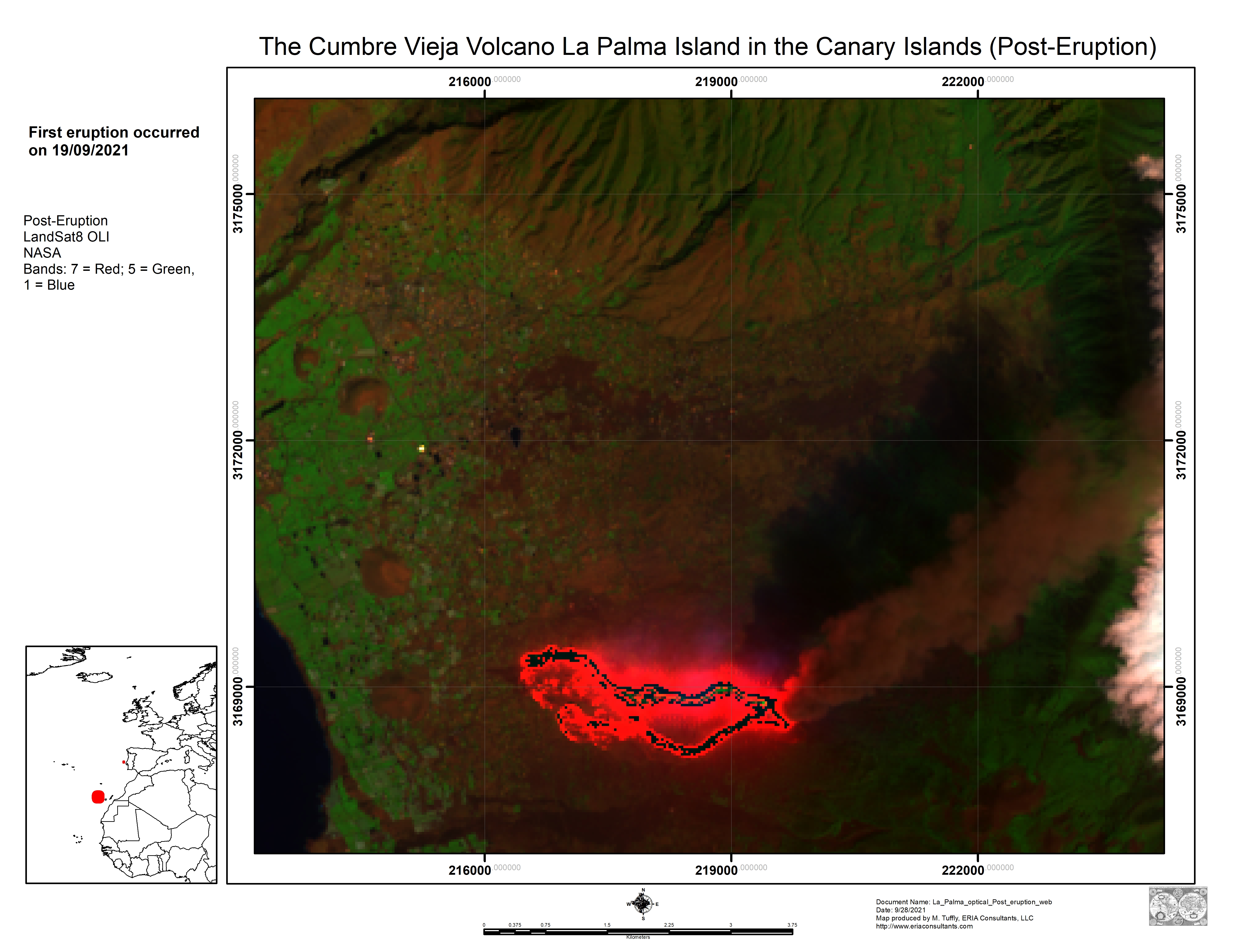 Cumbre Vieja Volcano on La Palma Island in the Canary Islands using LandSat8-OLI)(September 26nd 2021)